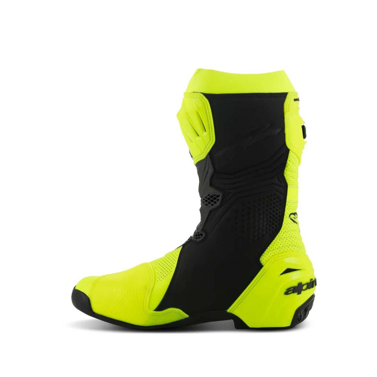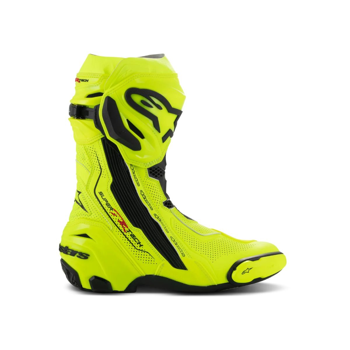 Almost every component of the Supertech R Vented Boot, Alpinestars definitive racing boot as worn by a roster of champions past and present, has undergone a rigorous program of upgrades to sharpen its performance features even further. Featuring extensive perforations throughout for maximum airflow, innovations derived using feedback from Alpinestars involvement in top flight racing include a newly redesigned front flex area, a redesigned rear bellow, a redesigned top gaitor, a new shifter and shin plate, a new shin slider and a new inner bootie, all of which enhance the comfort, protection and the performance of this boot to a new class-leading high.